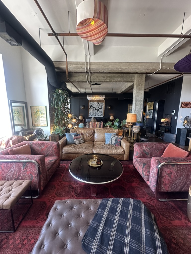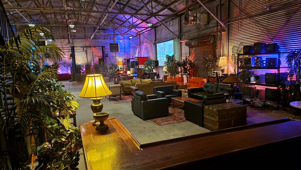 ID345 contains conference tables, privacy booths, and multiple cozy couch areas with tables. A kitchen with an accessible refrigerator, coffee, tea bar, and assortment of other beverage items. Fast Wifi, a projector, and a printer. Large garage door for fresh air and sunshine. LoFi radio, amber lighting, and vintage tech for a soft industrial ambience.